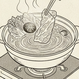 請用筷子夾起一片肉,放入沸騰的高湯中輕輕撥動 5 至 10 秒,隨後蘸上醬汁 即可享用。