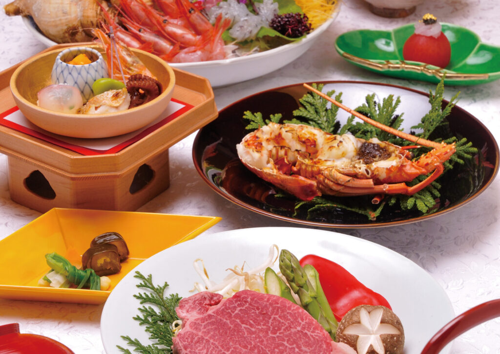 越中和食コースとして、天然のいけす富山湾の魚介類、地場のお野菜など、旬の食材を使った料理に、柿里自慢の肉料理を加えました。