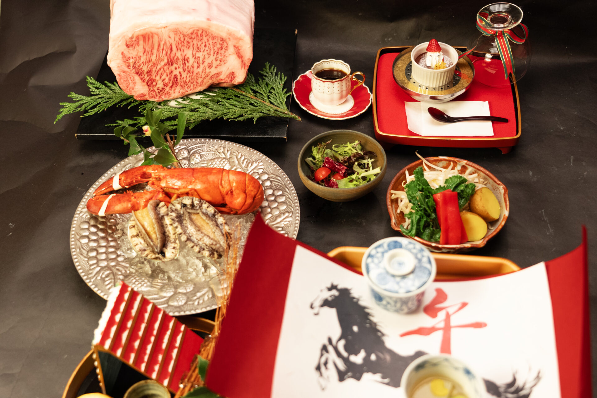 先付、前菜、スープ、サラダ、活伊勢海老グリル、活あわびグリル、焼き野菜、厳選和牛(A5)ステーキ、お食事、 デザート、コーヒー※5日前までに要予約