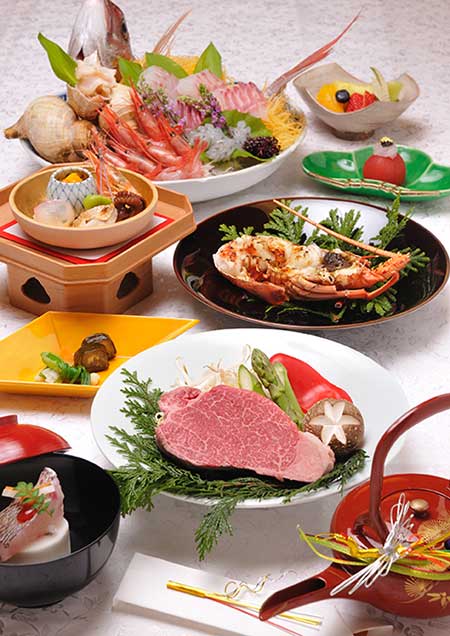 - 前菜、椀物、お刺身、焼物、煮物、和牛ステーキ、